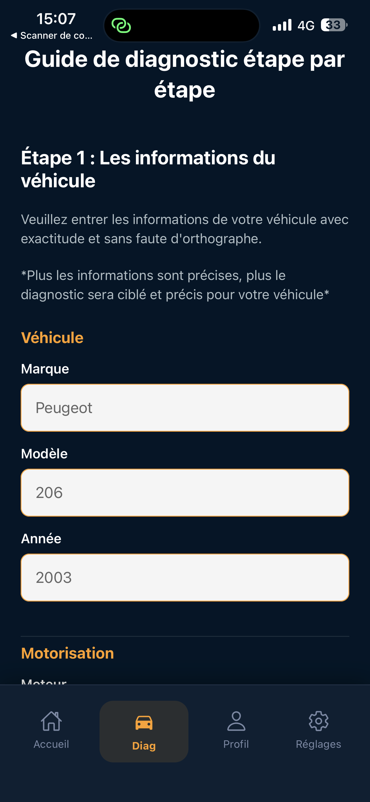 AutoDiag+ vous guide avec un diagnostic adapté à votre véhicule — marque, modèle, motorisation et année — pour mieux comprendre les pannes et éviter les réparations inutiles.