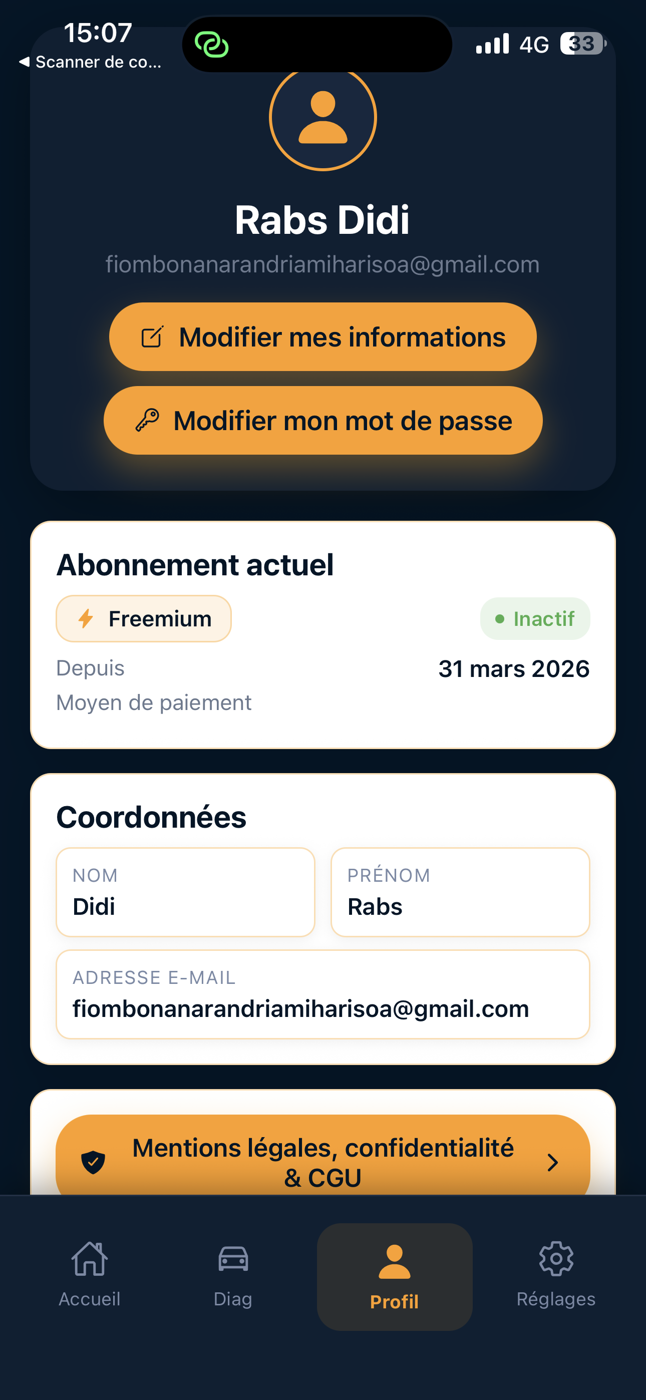 Nous collectons et traitons certaines données personnelles afin de fournir les fonctionnalités de diagnostic automobile, gérer votre compte et votre abonnement, et assurer le bon fonctionnement du service.