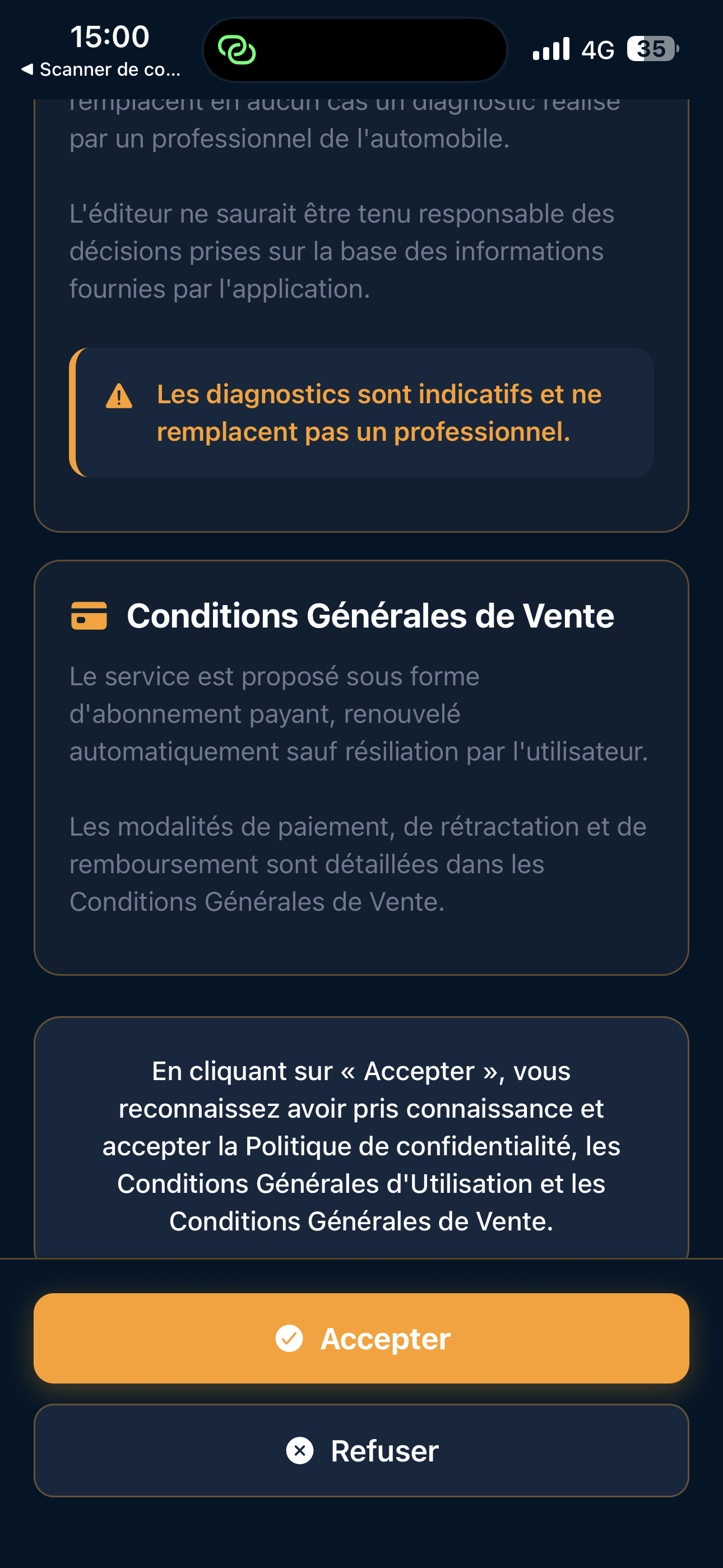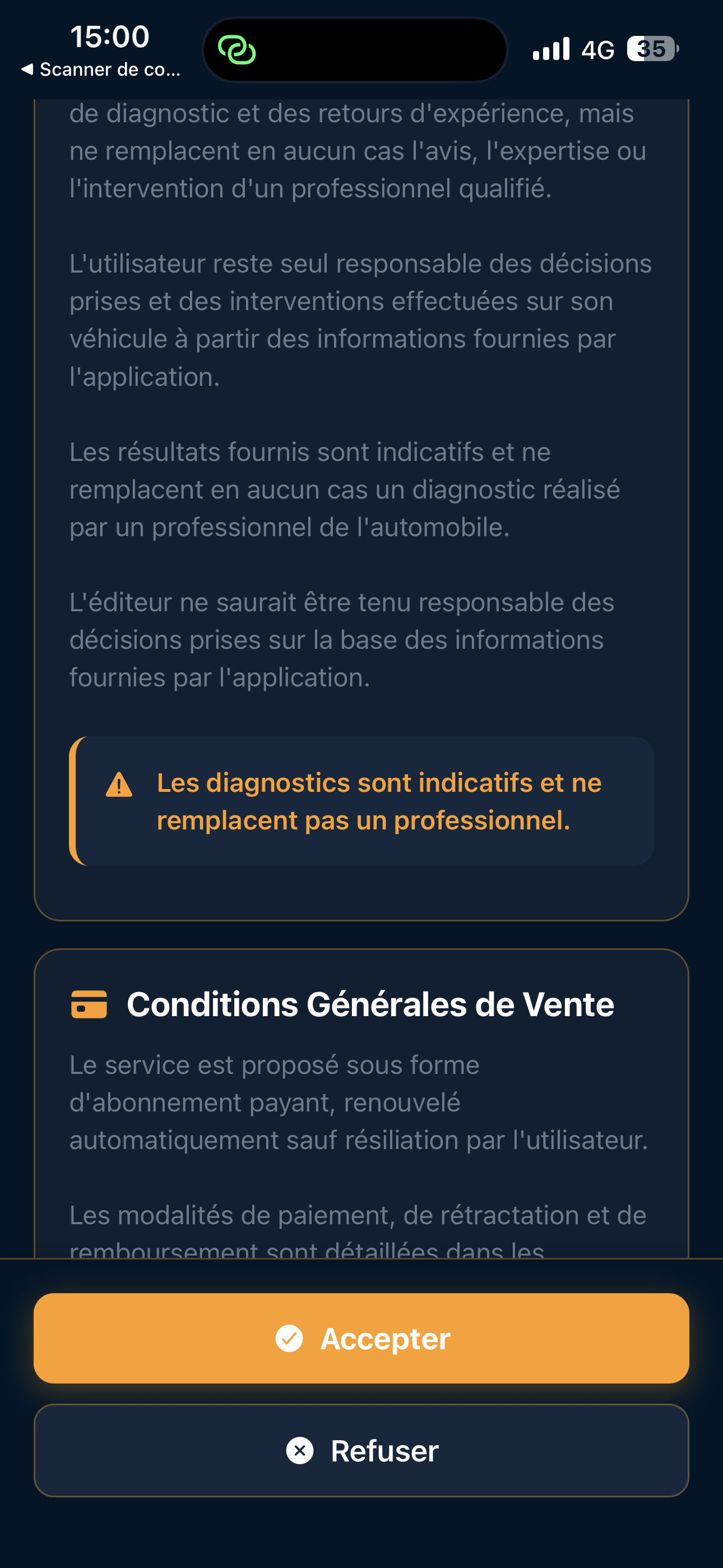 L’accès au diagnostic guidé peut être conditionné à un essai gratuit de 7 jours et/ou à un abonnement. À l’expiration de l’essai gratuit ou d’un abonnement, l’utilisateur peut ne plus avoir accès au diagnostic guidé. L’historique des diagnostics peut rester consultable dans l’application.